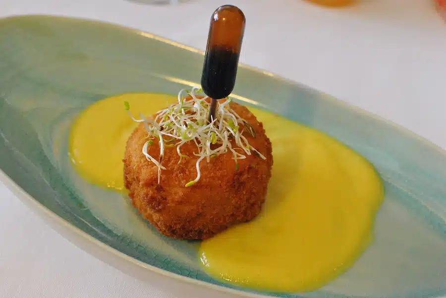 J’ ai vraiment aimé le cromesqui, servi avec sa vinaigrette à la pipette. Le poisson était parfaitement cuit et l’accompagnement crème citron/purée de carottes au cumin était bien équilibré et assorti parfaitement avec du poisson blanc. Quant au crottin de la croûte de chèvre, qui rappelait l’entrée : un délice ! Et du côté dessert, il était parfait pour finir le repas sur une note sucrée et pas trop lourde.
