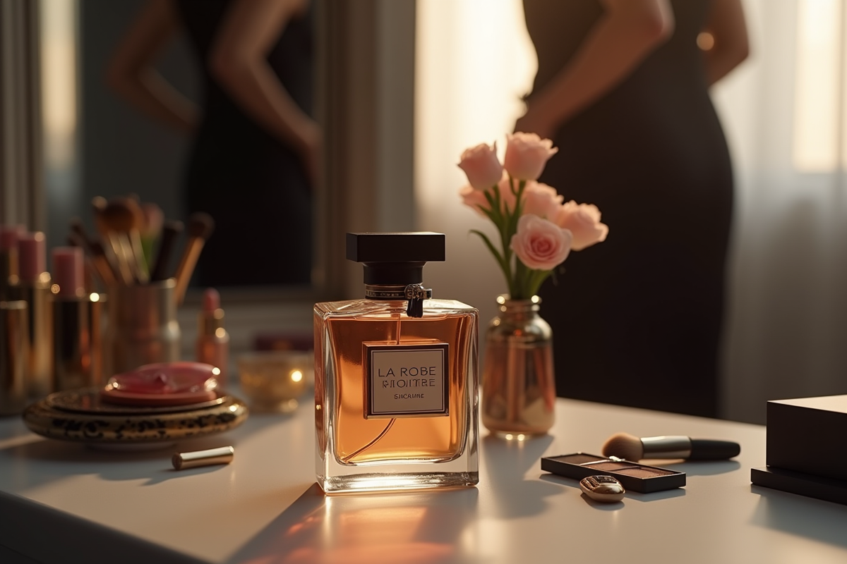 Le flacon, avec sa silhouette en forme de cœur inversé et son bouchon en forme de parapluie noir, évoque la sophistication et le mystère. Cette esthétique raffinée est le fruit d’un travail minutieux, visant à capturer l’essence même de la petite robe noire.
