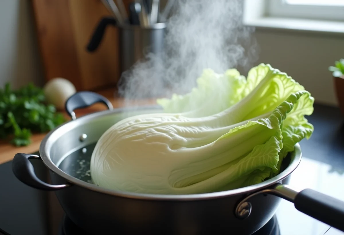 2. Ébullition de l’eau : dans une grande casserole, portez à ébullition une quantité suffisante d’eau. Ajoutez une pincée de sel pour aider à préserver les couleurs et les nutriments du chou.